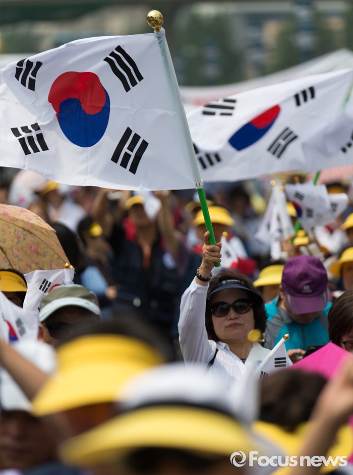 (서울=포커스뉴스) 14일 오후 서울역광장에서 열린 '북핵 규탄 및 평화통일 기원대회'에 참가한 한국자유총연맹 회원들이 태극기를 들고 있다.