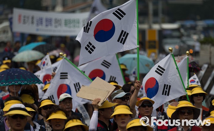 (서울=포커스뉴스) 14일 오후 서울역광장에서 열린 '북핵 규탄 및 평화통일 기원대회'에 참가한 한국자유총연맹 회원들이 태극기를 들고 있다.