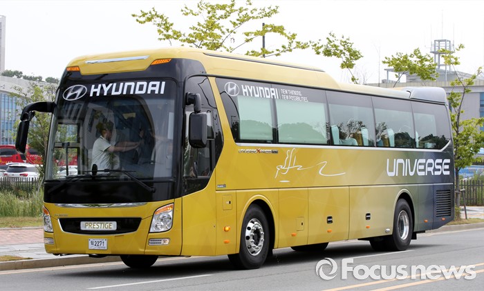 (세종=포커스뉴스) 프리미엄 고속버스 도입에 앞서 시승행사가 14일 오전 세종시 정부세종청사 제2주차장에서 열렸다. 사진은 현대자동차 21인승 프레스티지 유니버스 외부모습.