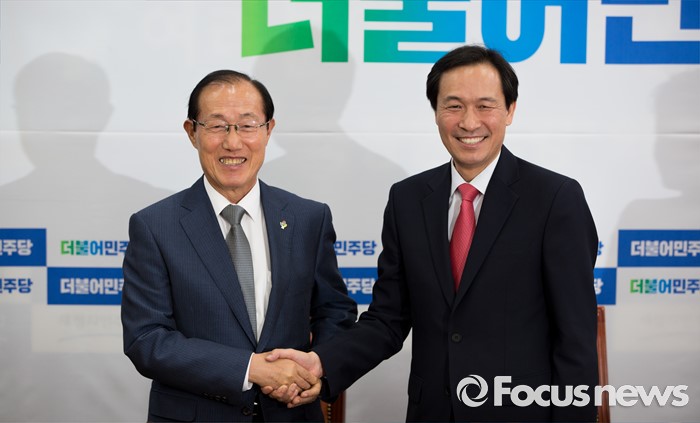 (서울=포커스뉴스) 우상호(오른쪽) 더불어민주당 원내대표가 14일 오후 서울 여의도 국회에서 이원종 대통령비서실장과 면담에 앞서 악수 하고 있다.