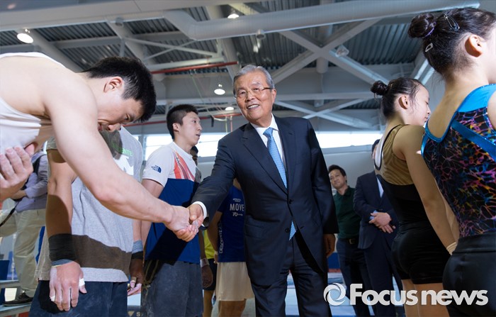 (서울=포커스뉴스) 리우데자네이루 하계올림픽을 52일여 앞둔 14일 오후 서울 노원구 태릉선수촌을 방문한 김종인 더불어민주당 비상대책위원회 대표가 기계체조 국가대표 선수들을 격려하고 있다.