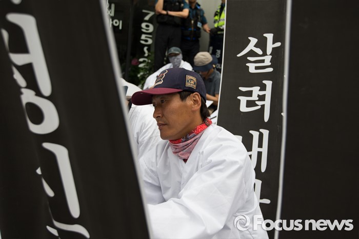 (서울=포커스뉴스) 14일 오후 유성기업 노동자 故 한광호씨의 분향소를 양재동 현대차 본사 앞으로 옮기는 꽃길 100리 행진 2일째에 참여한 노동자들이 국회를 출발해 한남동 현대차 정몽구 회장 집으로 향하던 길에 경찰과 대치하고 있다.