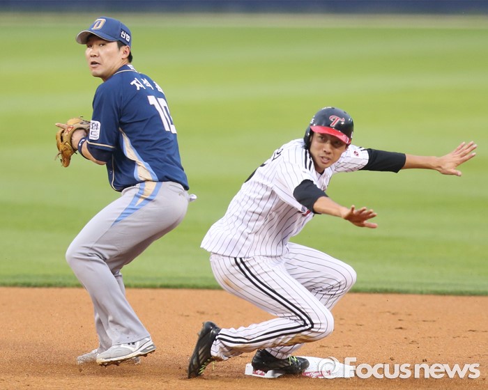 (서울=포커스뉴스) 14일 서울 잠실구장에서 열린 2016 프로야구 NC-LG 경기 1회말 1사 1루에서 LG 정성훈의 유격수앞 땅볼때 1루주자 김용의가 2루에서 세이프되고 있다.
