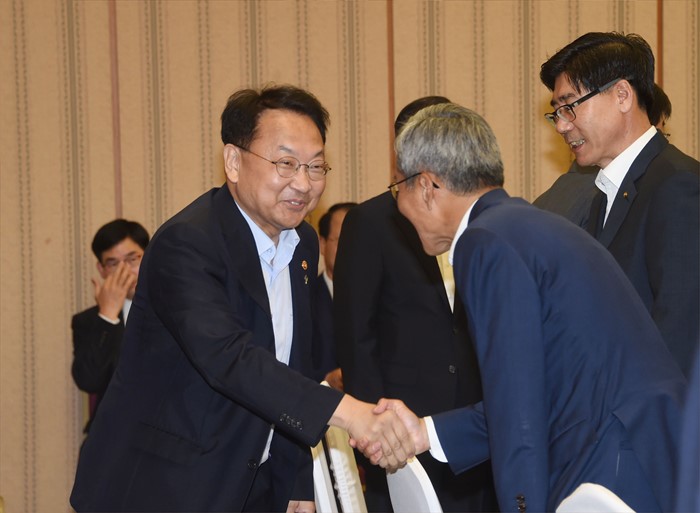 (서울=포커스뉴스) 유일호 부총리 겸 기획재정부 장관이 6월 14일 오후 서울 명동 은행연합회에서 열린 '정부-금융권 간 보조금 집행관리 업무협약식'에서 참석자와 악수를 하고 있다. <사진제공=기획재정부>