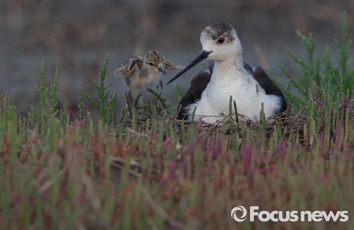 (인천=포커스뉴스) 장다리물떼새 새끼가 둥지 근처에서 놀다가 동생들 부화시키려고 알을 품고 있는 아빠 곁으로 오고 있다.