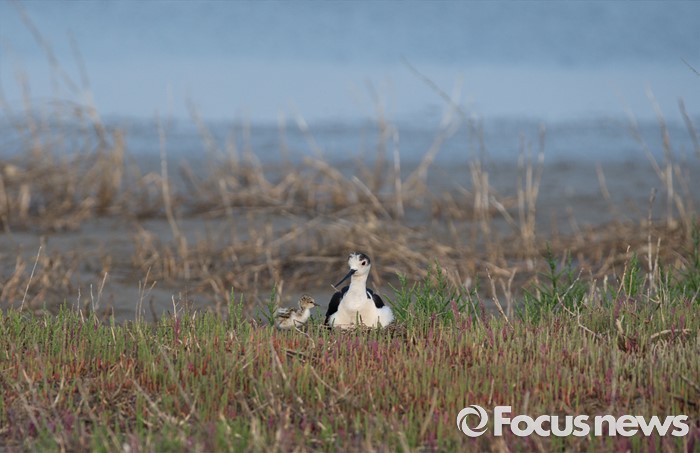 (인천=포커스뉴스) 인천시 영종도 갯벌 매립지에서장다리물떼새 수컷이 알을 품고 있는 둥지곁에서 하루 먼저 부화된 새끼가 아빠와 함게 정겹게 앉아 있다.