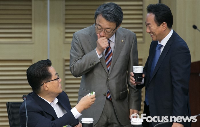 (서울=포커스뉴스) 15일 오전 서울 여의도 국회 의원회관에서 열린 15차 국민의당 정책역량강화 집중 워크숍에 참석한 박지원(왼쪽부터) 원내대표, 김성식 정책위의장, 김명진 원내대표비서실장이 대화하고 있다.