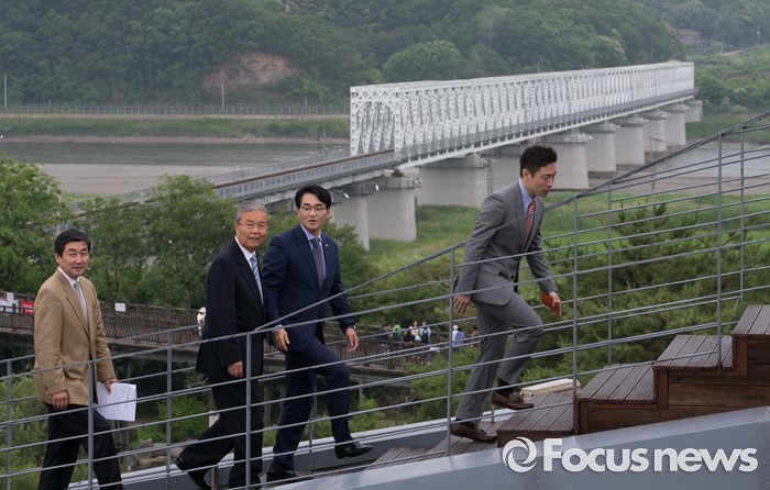 (파주=포커스뉴스) 15일 오전 경기도 파주 임진각 통일전망대에서 열린 더불어민주당 비상대책위원회의에 김종인 비대위 대표와 의원들이 참석하고 있다.