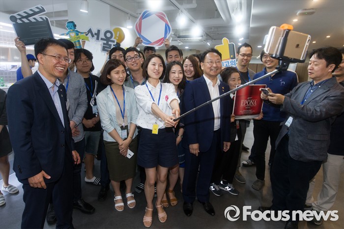 (서울=포커스뉴스) 유일호 경제부총리 겸 기획재정부 장관이 15일 오전 서울 종로구 서울창조경제혁신센터 부속 인큐베이팅 센터에서 입주기업을 둘러본 후 관계자들과 기념촬영을 하고 있다.