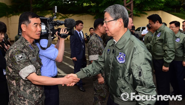 (오산=포커스뉴스) 김희옥 새누리당 혁신비상대책위원장, 정진석 원내대표가 15일 오전 경기도 오산 공군작전사령부를 방문해 군 관계자들과 인사하고 있다.