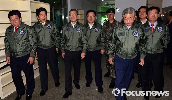 (오산=포커스뉴스) 김희옥 새누리당 혁신비상대책위원장, 김광림 정책위의장 등 의원들이 15일 오전 경기도 오산 공군작전사령부를 방문해 공군 방위태세 현황 등 보고를 받기 위해 이동하고 있다.