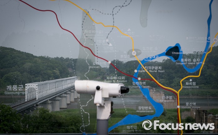 (파주=포커스뉴스) 6·15 남북공동선언 16주기인 15일 오전 경기도 파주 임진각 통일전망대에서 임진각 철교가 보이고 있다.