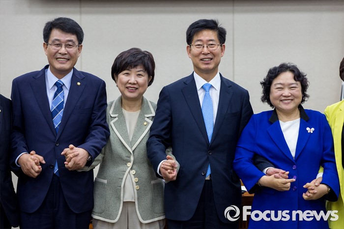 (서울=포커스뉴스) 양승조(왼쪽쪽 세 번째) 국회 보건복지위원회 위원장을 비롯한 3당 간사들이 15일 오전 서울 여의도 국회에서 열린 '보건복지위원회 전체회의'를 마친 손을 맞잡고 사진촬영을 하고 있다. 왼쪽부터 김광수 국민의당 간사, 박인숙 새누리당 간사, 양승조 위원장, 인재근 더불어민주당 간사.