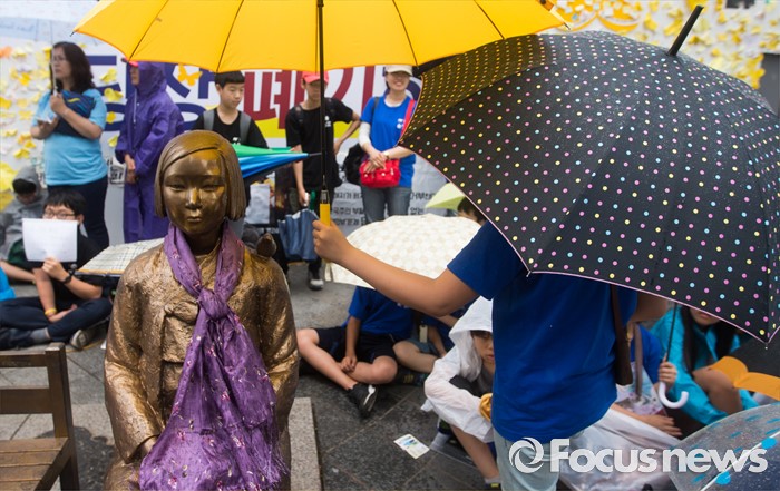 (서울=포커스뉴스) 15일 오후 서울 종로구 옛 일본대사관 앞에서 열린 제1235차 일본군 위안부 문제해결을 위한 정기 수요집회 참석한 한 학생이 소녀상에게 우산을 씌어주고 있다.