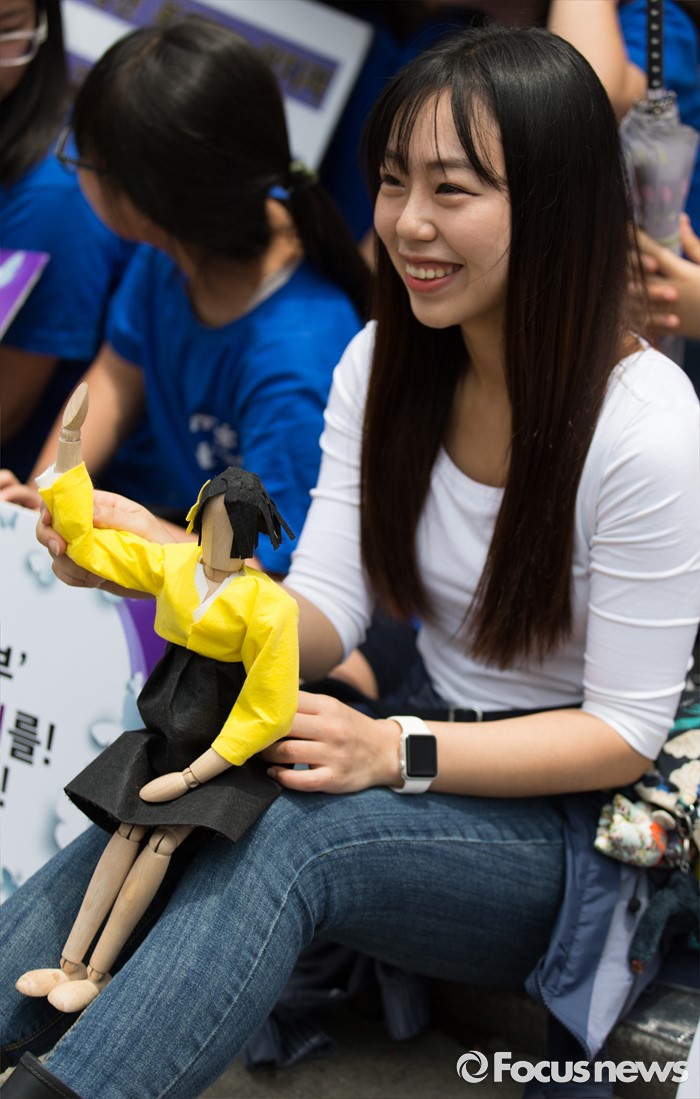 (서울=포커스뉴스) 15일 오후 서울 종로구 옛 일본대사관 앞에서 열린 제1235차 일본군 위안부 문제해결을 위한 정기 수요집회 참석한 한 시민이 소녀상 인형을 들고 있다.
