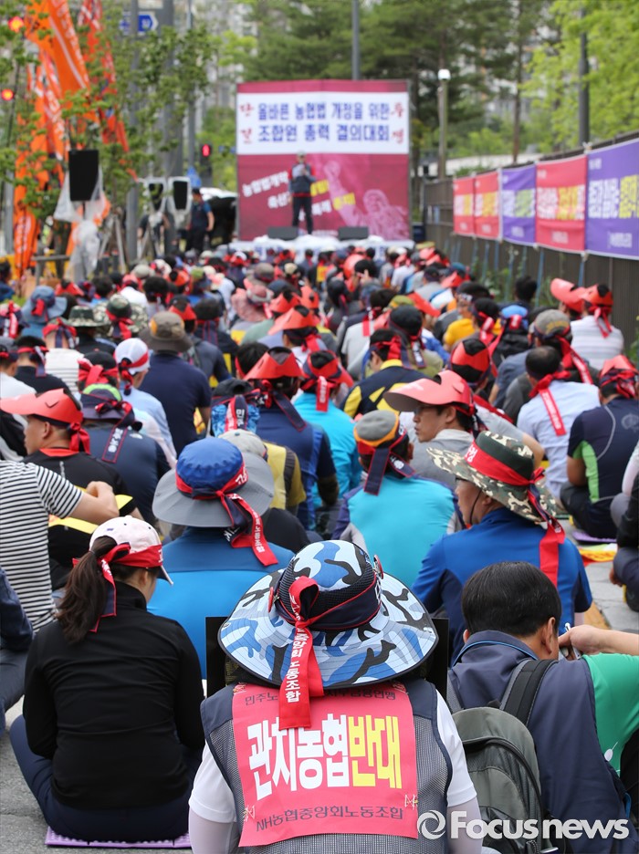(세종=포커스뉴스) NH농협중앙회노동조합 구성원들이 15일 오전 세종시 정부세종청사 농림축산식품부 앞에서 농협법 개정안 반대 투쟁 선포식을 열고 농협법 개정반대를 촉구하고 있다.