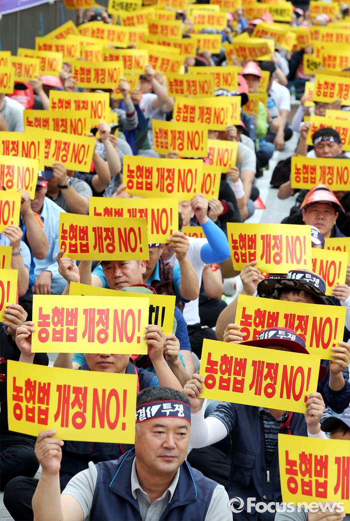 (세종=포커스뉴스) NH농협중앙회노동조합 구성원들이 15일 오전 세종시 정부세종청사 농림축산식품부 앞에서 농협법 개정안 반대 투쟁 선포식을 열고 농협법 개정반대를 촉구하고 있다.