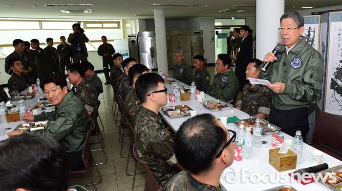 (오산=포커스뉴스) 김희옥 새누리당 혁신비상대책위원장이 15일 오후 경기도 오산 공군작전사령부를 방문해 오찬에 앞서 장병들에게 격려사를 하고 있다.