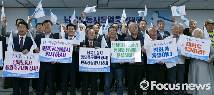 (서울=포커스뉴스) 15일 오후 서울 여의도 국회도서관에서 남북노동자통일축구대회 공동추진위원회 결성식를 마친 김동만 한국노총 위원장, 최종진 민주노총 위원장 직무대행 등 남측 추진위원회 참석자들이 한반도기를 흔들며 취재진을 향해 포즈를 취하고 있다.