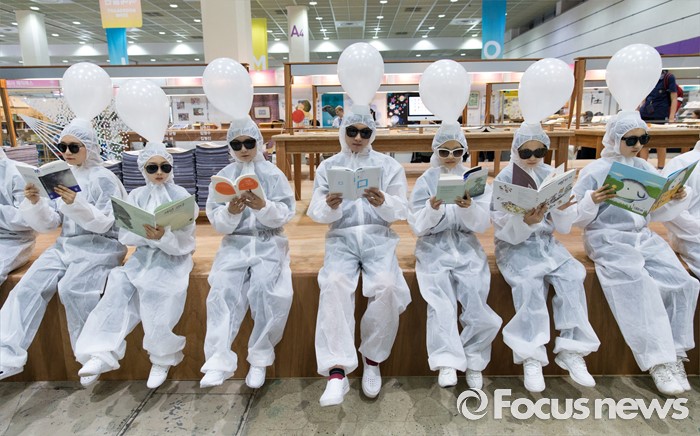 (서울=포커스뉴스) 15일 오후 서울 강남구 코엑스에서 열린 2016 서울국제도서전에서 상상발전소 관계자들이 독서를 장려하는 퍼포먼스를 하고 있다.