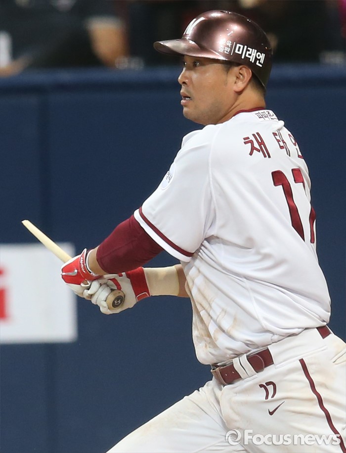 (서울=포커스뉴스) 15일 서울 고척 스카이돔 구장에서 열린 2016 프로야구 롯데-넥센 경기 2회말 넥센 채태인이 타격 도중 배트가 부러지며 손잡이만 잡고 있다.