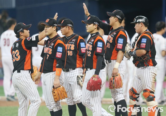 (서울=포커스뉴스) 15일 서울 고척 스카이돔 구장에서 열린 2016 프로야구 롯데-넥센 경기에서 전 날의 패배를 설욕한 롯데 선수들이 마운드에 모여 하이파이브하며 승리의 기쁨을 함께하고 있다.