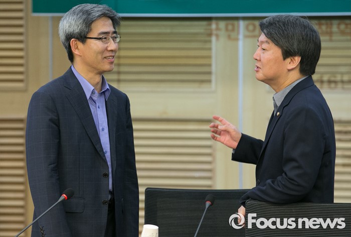 (서울=포커스뉴스) 16일 오전 서울 여의도 국회 의원회관에서 열린 국민의당 16차 정책역량강화 워크숍에 참석한 안철수(오른쪽) 상임공동대표와 홍종호 서울대 환경대학원 교수가 대화하고 있다.