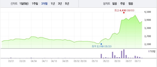 이는 1달 전 주가인 5월16일(2265원)과 비교했을 때 67.3% 상승한 수치다.