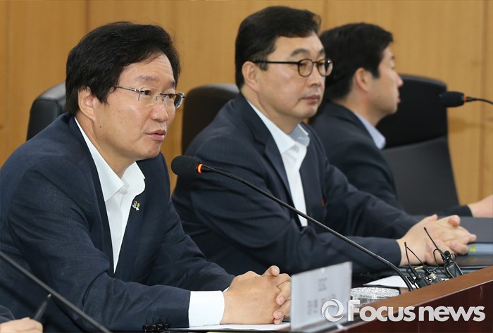 (세종=포커스뉴스) 김영석(왼쪽) 해양수산부 장관이 16일 오전 세종시 정부세종청사 해수부 중회의실에서 열린 세월호 공정 점검회의에 참석해 모두발언을 하고 있다.