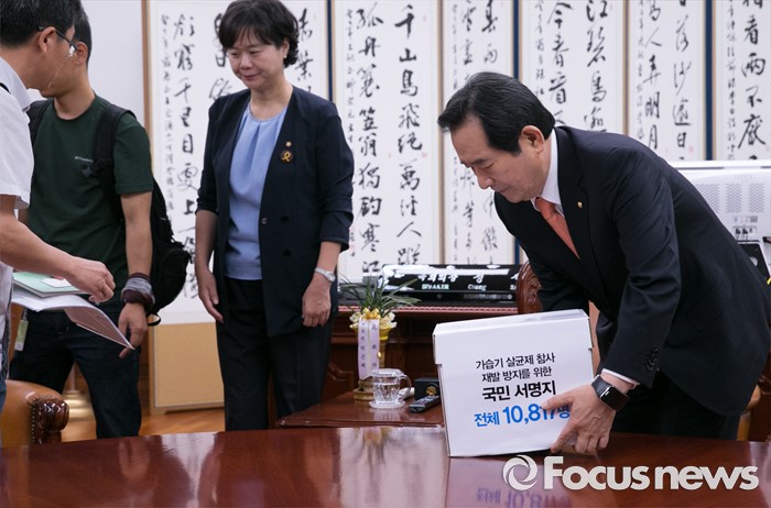 (서울=포커스뉴스) 정세균(오른쪽 첫번째) 국회의장이 16일 오전 서울 여의도 국회 의장집무실을 방문한 이정미 정의당 원내수석부대표, 가습기살균제 피해자와 가족모임으로부터 대책마련 대국민 서명지를 전달받은 뒤 자리에 앉고 있다.