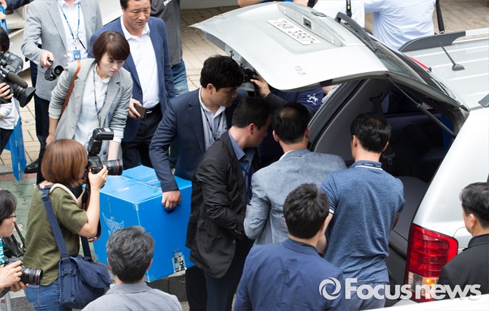 (서울=포커스뉴스) 공직선거법 위반 혐의를 수사하고 있는 경찰이 16일 오후 서울 종로구 참여연대 압수수색을 마치고 차량으로 압수품을 옮기고 있다.