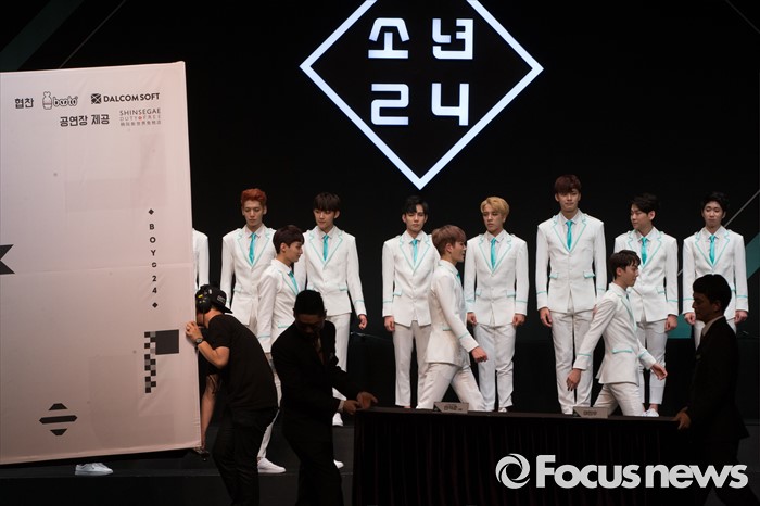 (서울=포커스뉴스) 16일 오후 서울 여의도구 63빌딩 그랜드볼룸에서 열린 보이그룹 오디션 프로그램 '소년24 프로젝트' 제작발표회에 참석한 49명의 출연자들이 퇴장하고 있다.