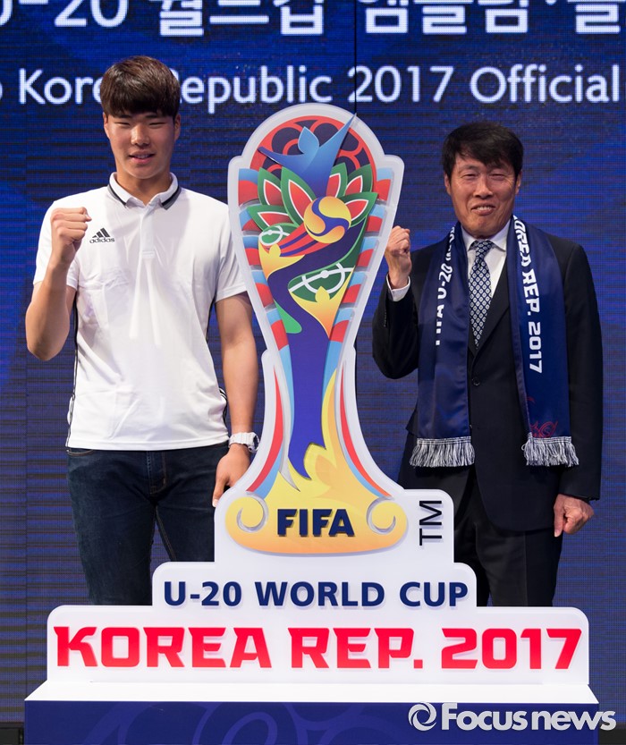 (서울=포커스뉴스) 16일 오후 서울 종로구 올레스퀘어에서 열린 FIFA U-20 월드컵 엠블럼·슬로건 발표 행사에서 차범근(오른쪽) U-20 월드컵 조직위원회 부위원장과 송범근(19·고려대)이 기념촬영을 하고 있다.