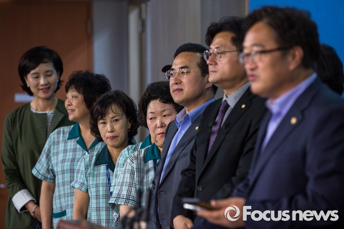 (서울=포커스뉴스) 국회 환경미화노동조합원들과 더불어민주당 을지로위원회 소속 위원들이 16일 오후 서울 여의도 국회에서 정세균 국회의장의 국회 환경미화원 직접고용 입장 발표에 환영의 뜻을 밝히는 기자회견을 하고 있다.