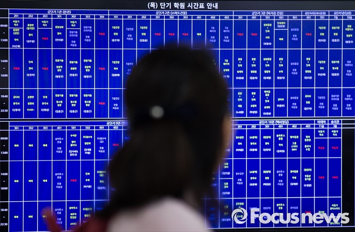 (서울=포커스뉴스) 지방직 9급 공무원 필기시험을 이틀 앞둔 15일 오후 서울 동작구 공단기 노량진학원에서 한 시험 응시자가 강의 시간표를 바라보고 있다.