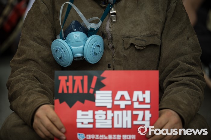 (서울=포커스뉴스) 이틀 전 총파업을 결의한 대우조선해양 노조가 16일 오후 서울 여의도 산업은행 앞에서 사측의 일방적 구조조정에 반대하며 상경투쟁을 벌이고 있다. 상경투쟁 집회 중 한 노동자가 '특수선 분할매각 저지' 플래카드를 들고 있다.