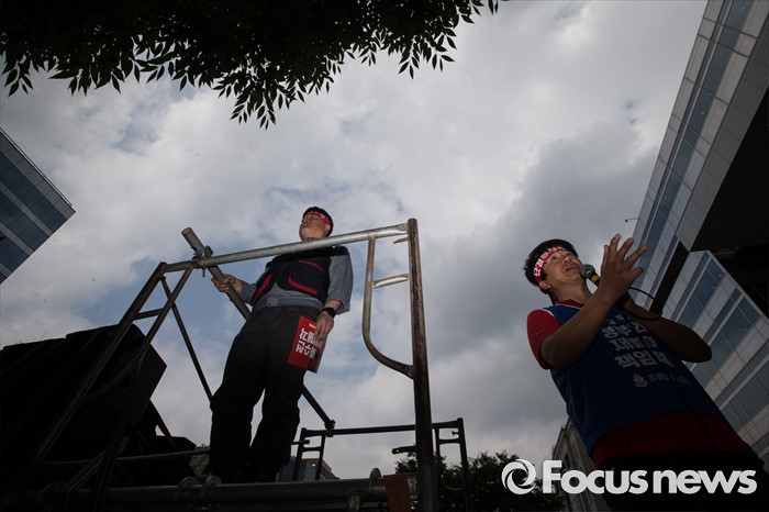 (서울=포커스뉴스) 이틀 전 총파업을 결의한 대우조선해양 노조가 16일 오후 서울 여의도 산업은행 앞에서 사측의 일방적 구조조정에 반대하며 상경투쟁을 벌이고 있다.