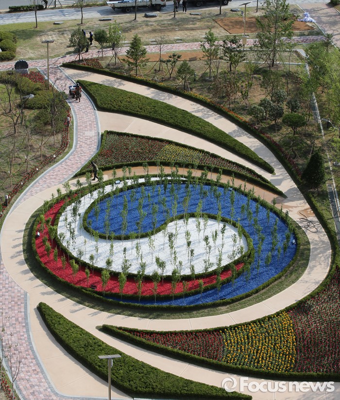 (세종=포커스뉴스) 16일 오후 세종시 정부세종청사 우정사업본부 인근에 '나라꽃동산' 개장식이 열렸다. 니라꽃동산은 정부상징문양인 삼색 태극문양으로 조성됐다.