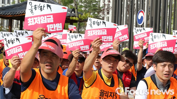 (세종=포커스뉴스) 민주노총 세종충남본부 조합원들이 16일 오후 정부세종청사 고용노동부 앞에서 최저임금 1만원 쟁취 집회를 갖고 있다. 이날 최저임금위원회 4차 전체회의가 열렸다.
