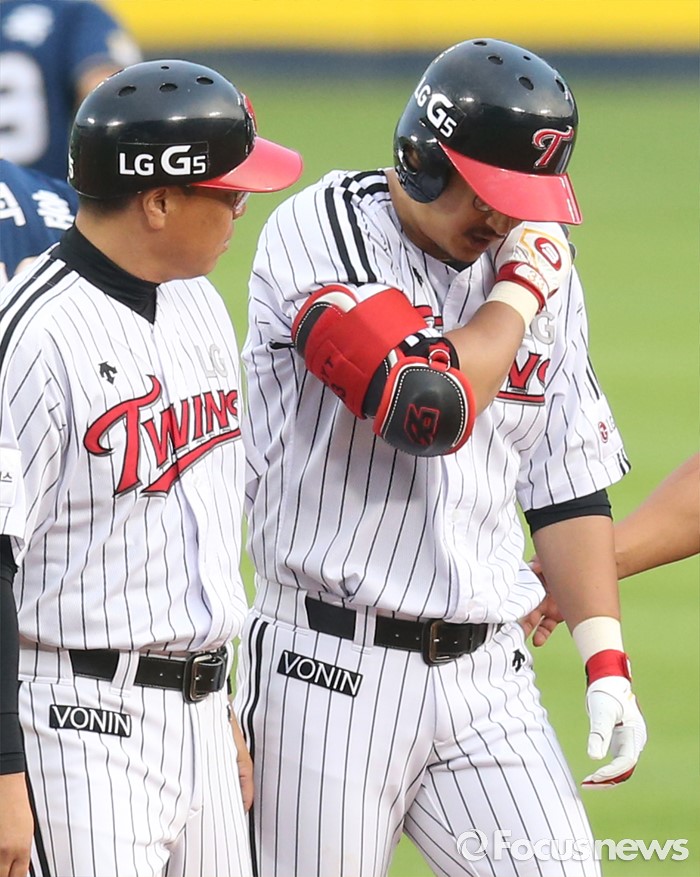 | △ 어깨를 감싸고 나가는 박용택 |