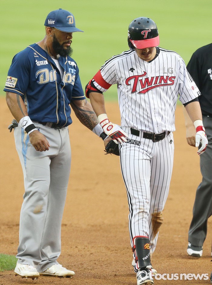 (서울=포커스뉴스) 16일 서울 잠실구장에서 열린 2016 프로야구 NC-LG 경기 3회말 1사후 2루에서 슬라이딩하다 왼쪽 어깨를 다친 LG 박용택을 NC 테임즈가 위로하고 있다.