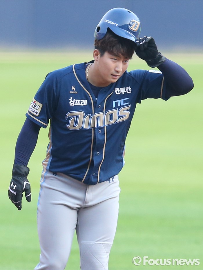 (서울=포커스뉴스) 16일 서울 잠실구장에서 열린 2016 프로야구 NC-LG 경기 1회초 1사 2루에서 좌전 적시타를 날린 NC 나성범이 테임즈의 우전 안타때 2루에 진루해 2루심에게 인사하고 있다.