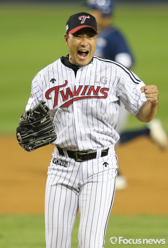 (서울=포커스뉴스) 16일 서울 잠실구장에서 열린 2016 프로야구 NC-LG 경기 7회초 2사 1,2루에서 구원 등판한 LG 봉중근이 NC 이종욱을 삼진 아웃시키고 주먹을 불끈 쥐며 환호하고 있다.