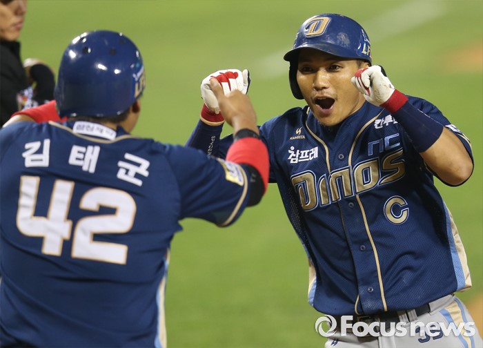 (서울=포커스뉴스) 16일 서울 잠실구장에서 열린 2016 프로야구 NC-LG 경기 9회초 2사 2루에서 NC 이종욱이 우월 2점 홈런을 치고 선행주자 김태군의 환영을 받으며 홈인하고 있다.