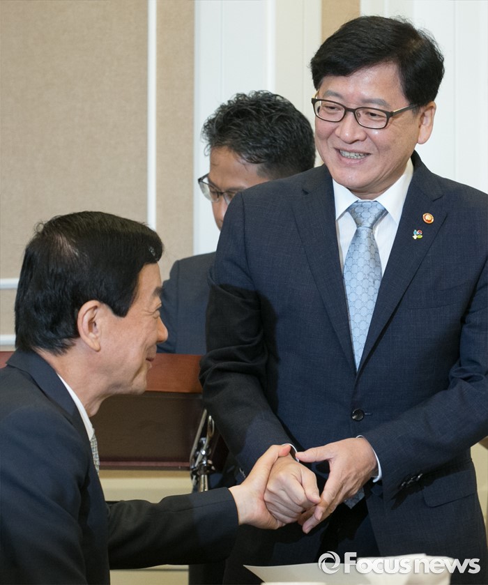 (서울=포커스뉴스) 17일 오전 서울 여의도 국회 귀빈식당에서 열린 국회 저출산극복 연구포럼 1차 회의에 참석한 진영(왼쪽) 더불어민주당 의원과 정진엽 보건복지부 장관이 인사하고 있다.