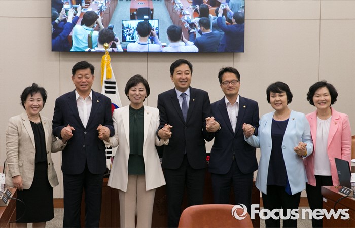 (서울=포커스뉴스) 17일 오전 서울 여의도 국회에서 여성가족위원회 전체회의를 마친 남인순 위원장과 3당 간사, 남성 위원들이 기념촬영을 하고 있다. 왼쪽부터 신용현 국민의당 간사, 김명연 새누리당 의원, 남 위원장, 금태섭, 박주민 더불어민당 의원, 정춘숙 간사, 윤종필 새누리당 간사.