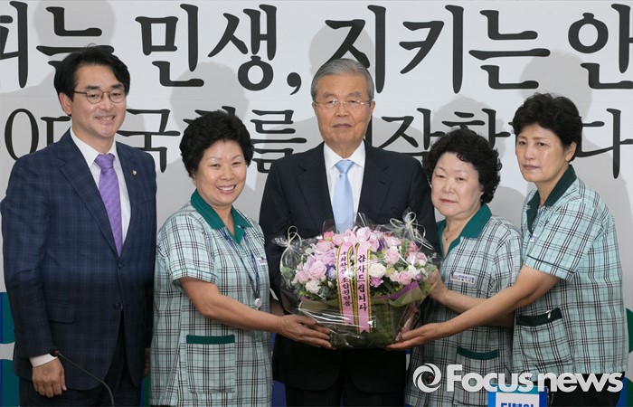 (서울=포커스뉴스) 김종인(왼쪽 세번째) 더불어민주당 비대위 대표가 17일 오전 서울 여의도 국회에서 김영숙(왼쪽 두번째) 국회 환경미화노동조합 위원장 등 관계자들에게 직접고용 해결과 관련 꽃다발을 증정받은 뒤 포즈를 취하고 있다. 왼쪽 첫번째는 박용진 대표비서실장.