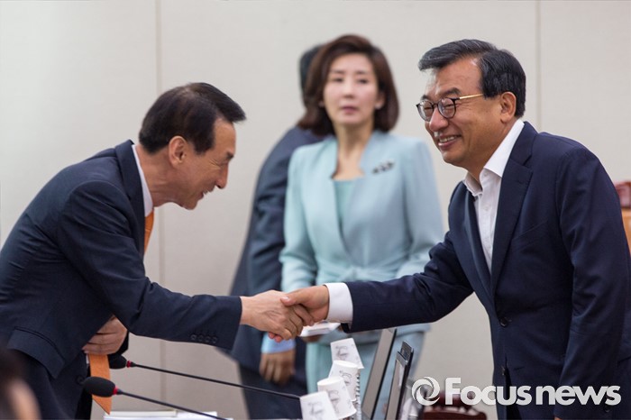 (서울=포커스뉴스) 이정현(오른쪽) 교육문화체육관광위원회 위원과 이석기 위원이 17일 오전 서울 여의도 국회에서 열린 '교육문화체육관광위원회 전체회의'에 참석해 악수 하고 있다.