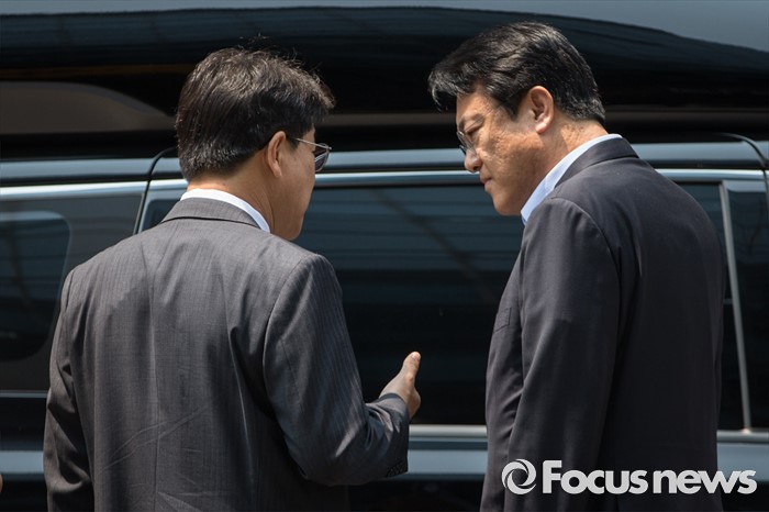 (서울=포커스뉴스) 정진석(오른쪽) 새누리당 원내대표가 17일 오후 서울 여의도 한 음식점에서 비공개 오찬약속을 위해 이동하며 권성동 사무총장과 대화하고 있다.