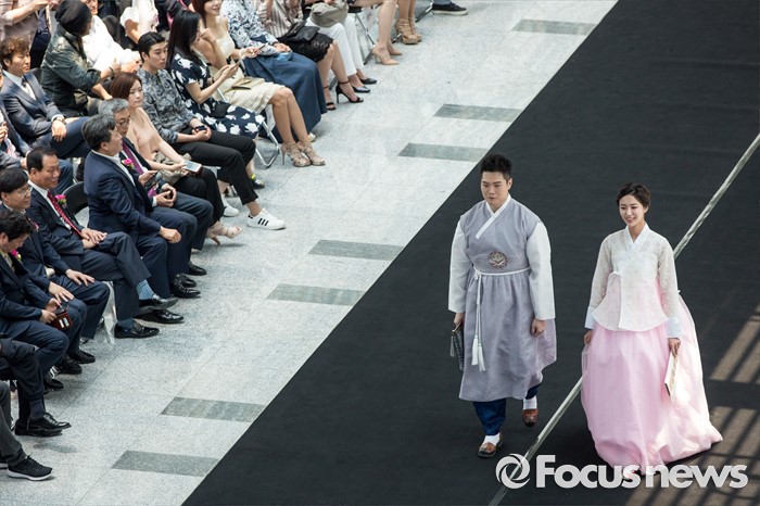 (서울=포커스뉴스) 17일 오후 서울 여의도 국회의원회관에서 열린 '2016 대한민국 국회 초청패션쇼-품'에서 모델들이 한복을 입고 멋진 워킹을 선보이고 있다.
